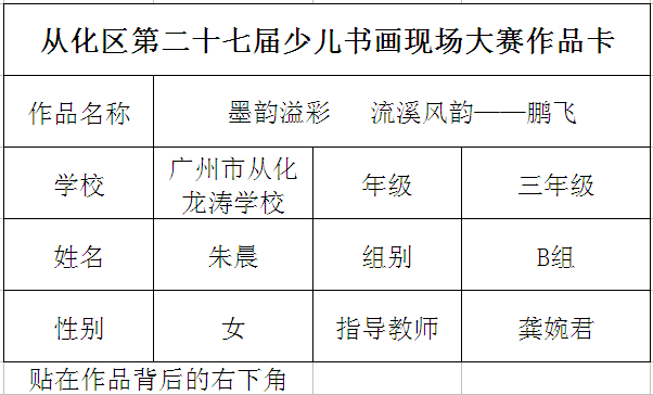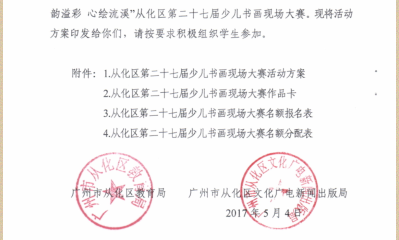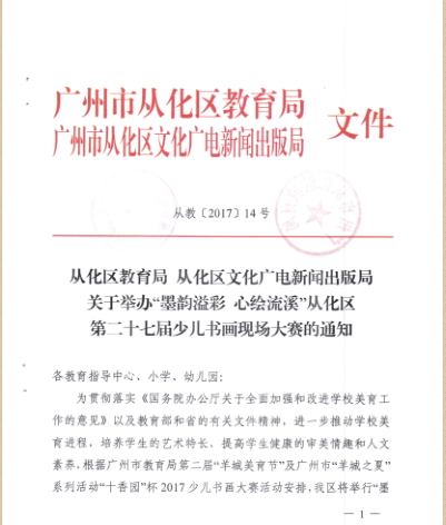 为展示学生书画风采,传承传统文化,营造校园文化建设氛围,为我校书画爱好者提供与其它学校交流和学习的平台,展示我校学生的优秀书画作品,丰富和活跃校园文化水平,学校组织参加了由从化区教育局、从化区文化广电新闻出版局联合举办的“从化区第二十七届少儿现场书画大赛”,比赛于6月1日在从化区七星体育馆举行。本次比赛有395名儿童参加,我校两名选手朱颖和朱晨获得优秀奖!