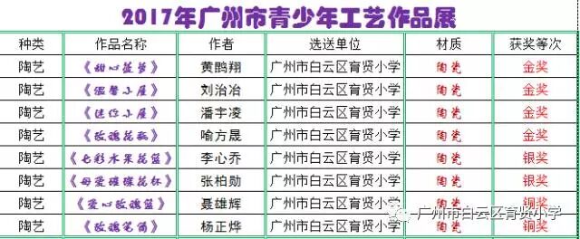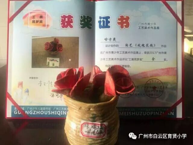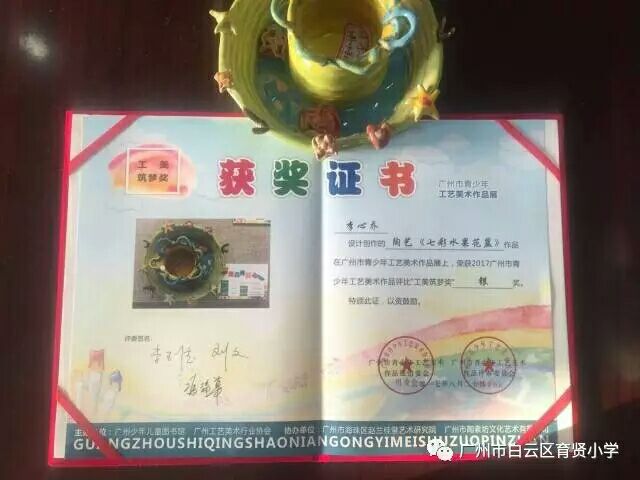 为了实现学生的全面发展,2017年春季,我校开展了陶艺特色课程,经过一学期的学习,在老师的悉心指导和同学们的努力下,我校的陶艺课程取得了不错的成果。在“2017年广州市青少年工艺美术作品评比工美筑梦奖”中,我校学生的陶艺作品,分别获得金奖、银奖和铜奖的优异成绩。