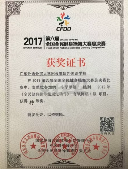 9月26日,我校健美操队传来好消息:队员们凭借着强劲的实力,出色的发挥,一举夺得小学甲组“全国全民健身操等级规定动作-有氧一级”特等奖。同时,秦予晨老师被评为“年度优秀教练员”。