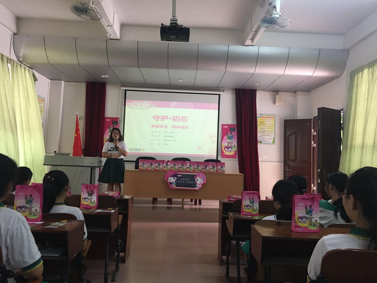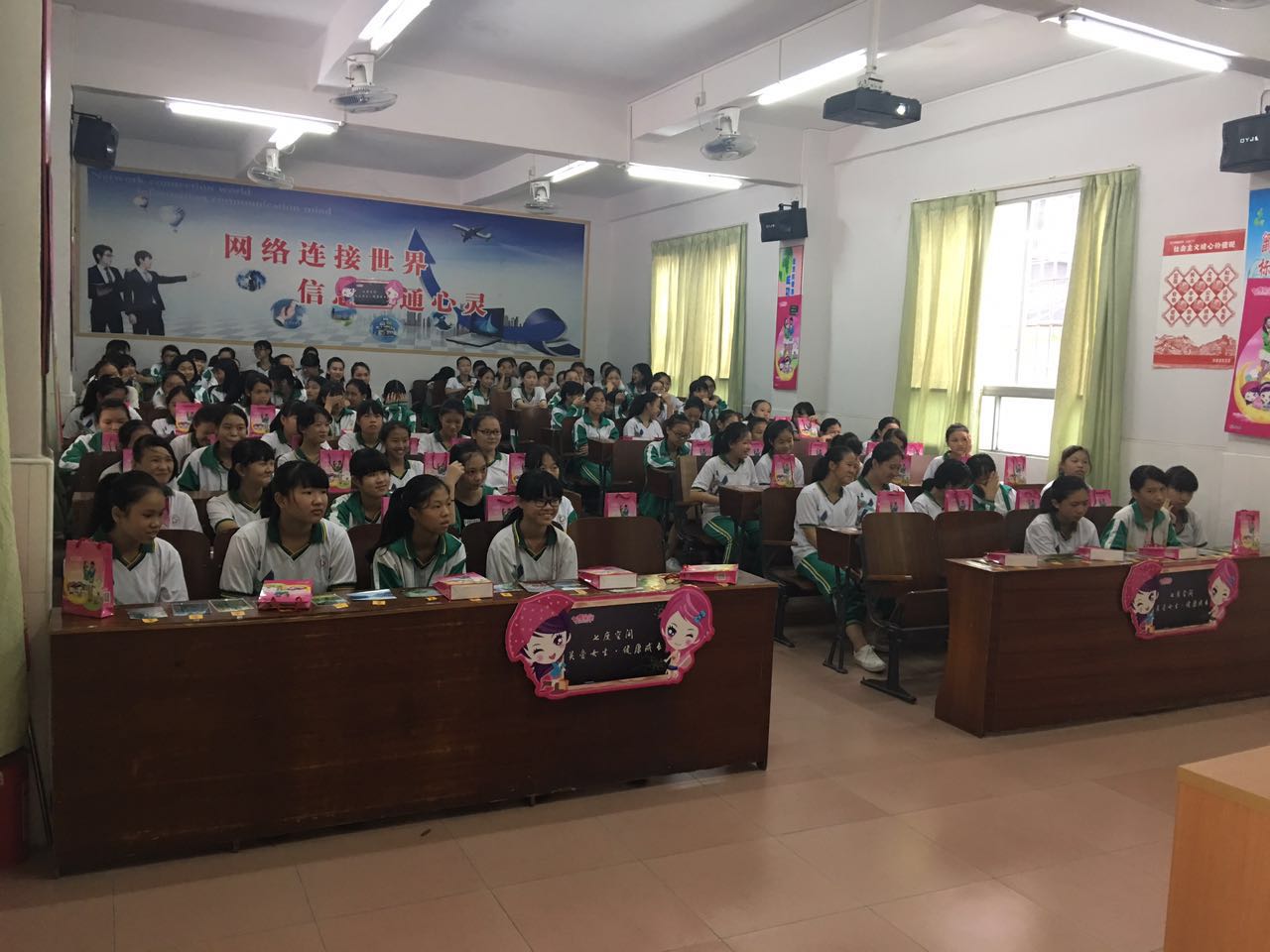 最后韦老师还给我们八年级的全体女同学送上了一些女生小礼品,女同学们由衷的感谢韦老师的授课和礼品,龙江中学也非常感谢韦老师的精彩演讲,也希望她们以后多多来我校,给我们更多的疏导!