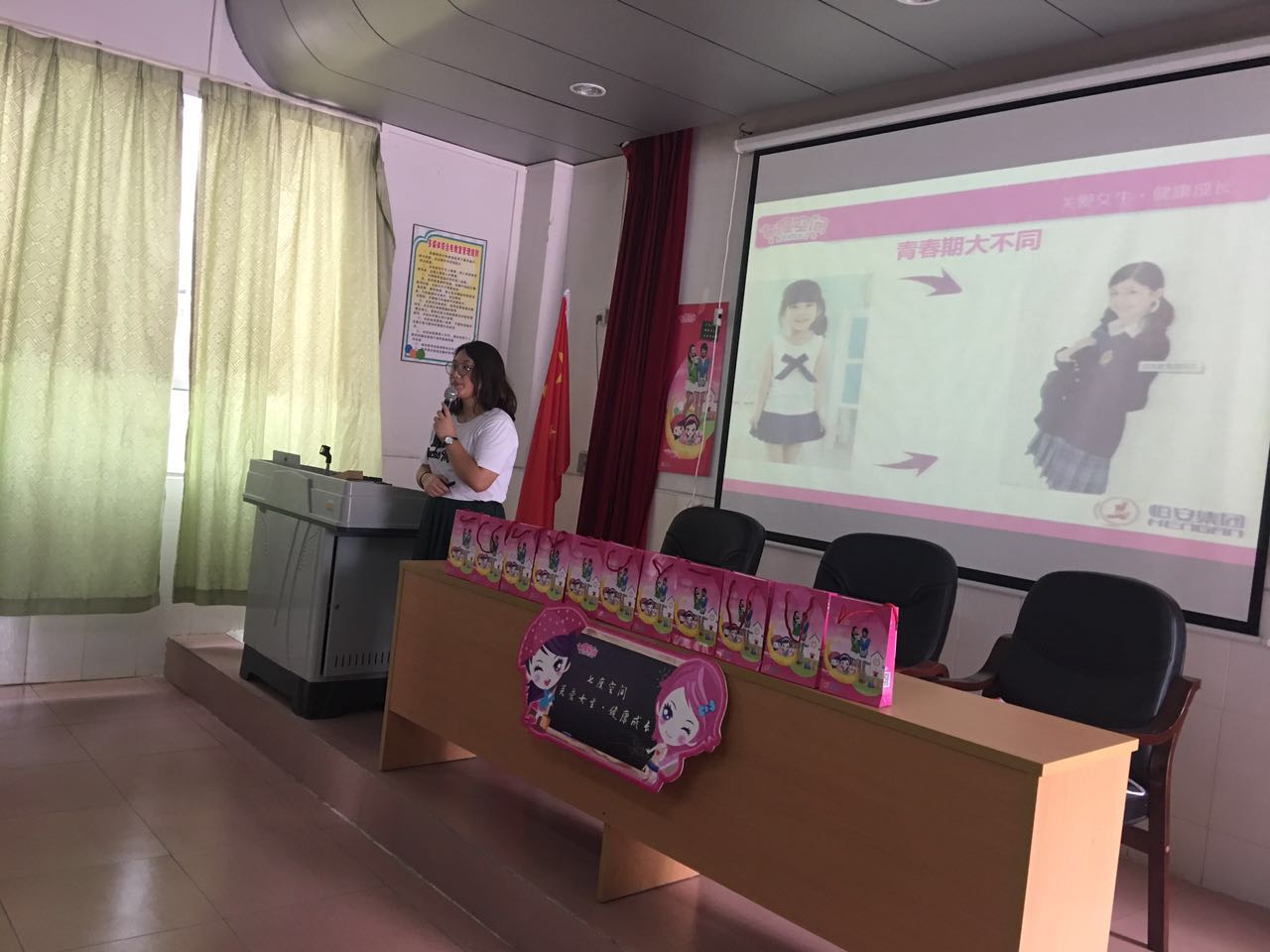 9月28日,南国广州天气较为炎热,但却迎来了青春期健康公益讲座的韦伟老师。韦老师是资历较深的一个专业讲师。执行过超三百场的讲座,经过不断的研究与开发,形成了自己的一个专业、生动的课程。主要是针对女生青春期的生理和心理方面进行深入的探讨。