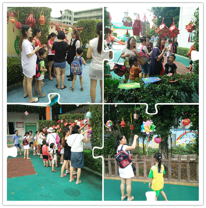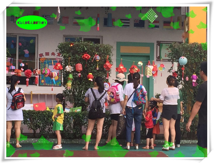 为了让孩子们对祖国悠久的历史文化有更深的了解,体验浓浓的中秋节日气氛,龙江幼儿园发动家长和孩子们一起制作灯笼。家长和孩子共同参与、发挥聪明才智,利用各种各样的环保材料,制作出创意无限的中秋灯笼,有可乐瓶做的麻花灯笼、利是封做的菱形灯笼、有废旧盒子做的五彩灯笼、有橘子皮做的娃娃灯笼等等!各种各样的灯笼别具匠心、色彩鲜明、造型巧妙,把幼儿园装扮得更加缤纷绚丽。不仅让孩子们感受到与家长一起制作灯笼的乐趣,还能体验到变废为宝的喜悦。