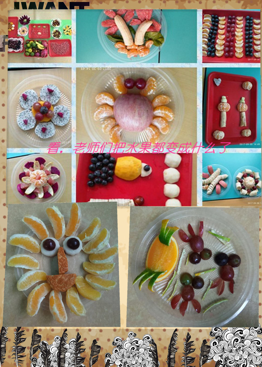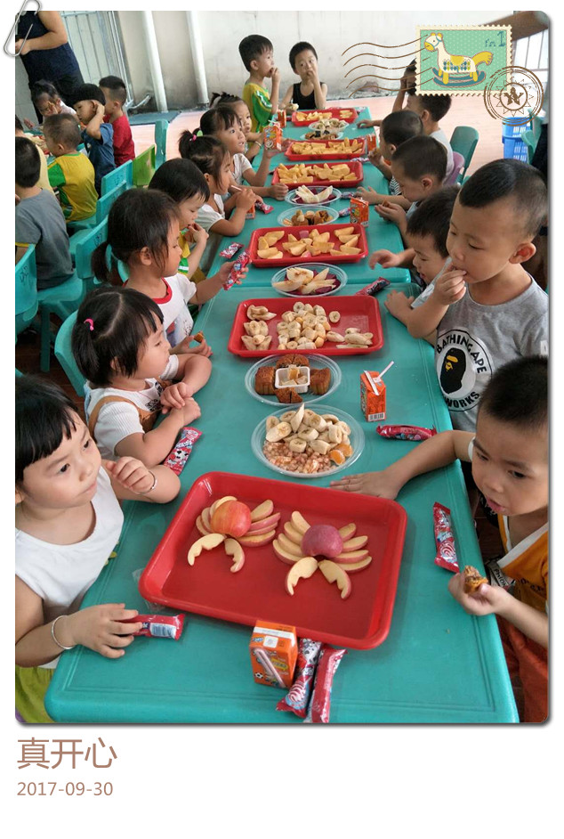 今天我们全体小朋友还在大厅一起进行了美食分享哦!老师给我们摆的果盘,看着都有食欲!