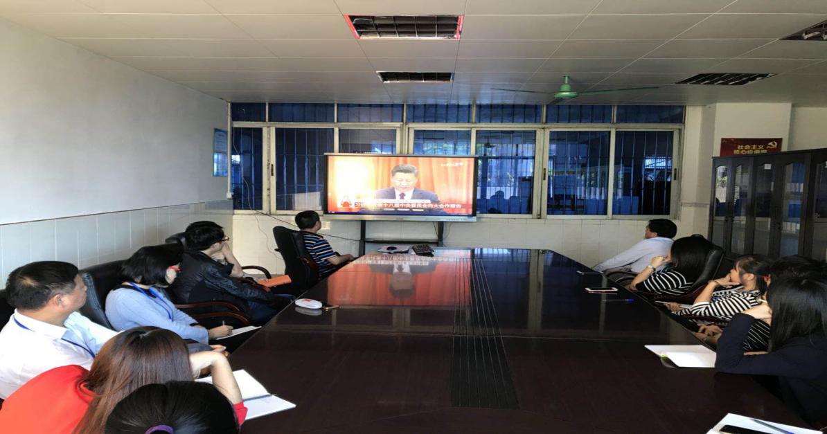 十月十八日,中国共产党第十九次全国代表大会在北京隆重召开。习近平总书记代表第十八届中央委员会向大会作了题为《决胜全面建成小康社会 夺取新时代中国特色社会主义伟大胜利》的报告。为了学习和贯彻党的十九大精神,早上九点,广州市白云区龙涛中学由张校组织全体无课教师一起观看了开幕式。