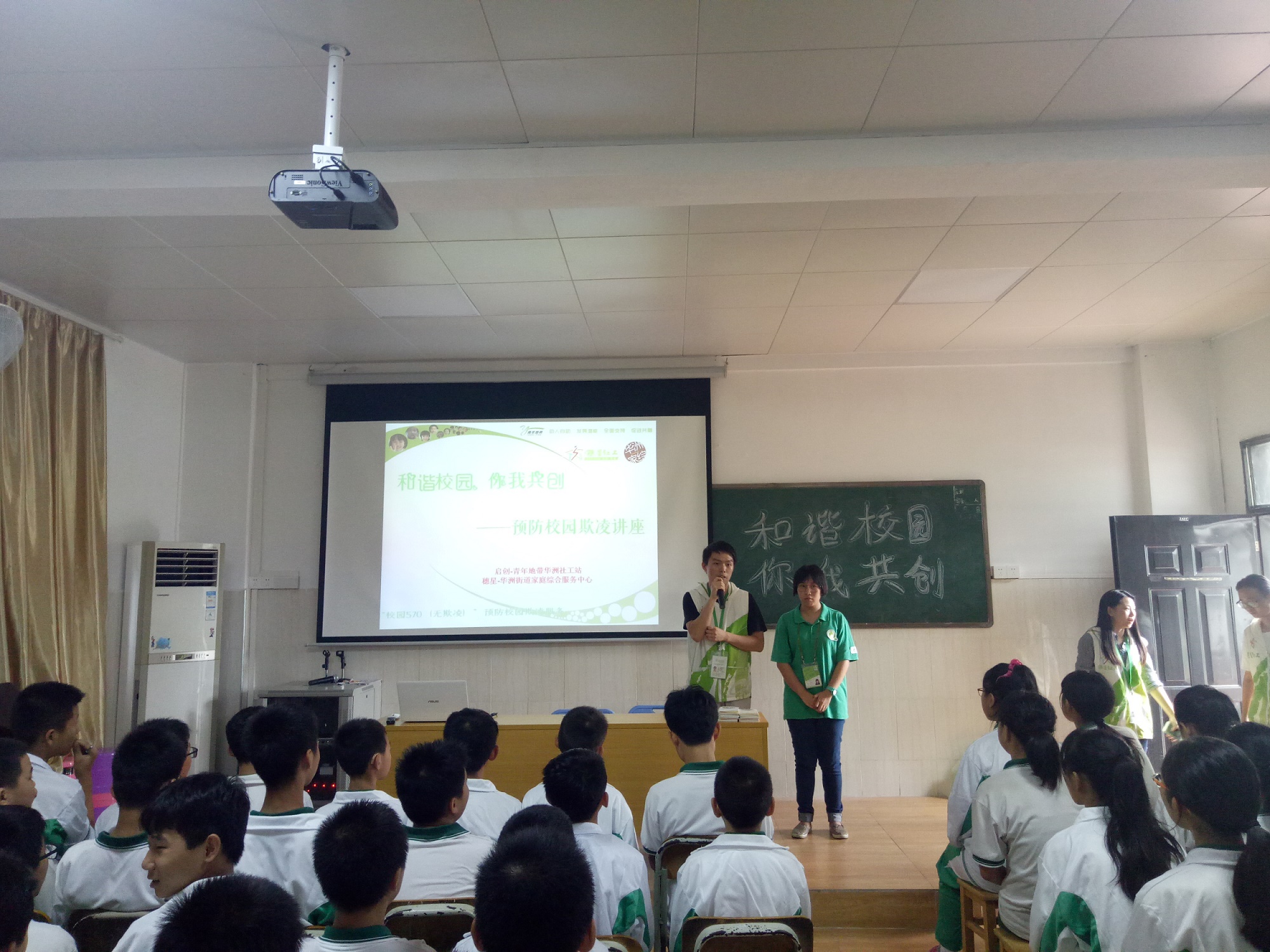 10月11日下午2点,广州市穗星社会工作服务中心在我校举办了以“防范校园欺凌”为主题的校园公益活动。社工们为同学们讲述了许多关于校园欺凌的事例,呼吁同学们要对校园欺凌说“NO!”,并且教授了在遇到校园欺凌时,我们该怎么办!