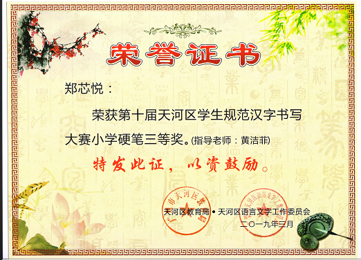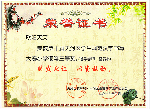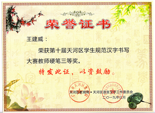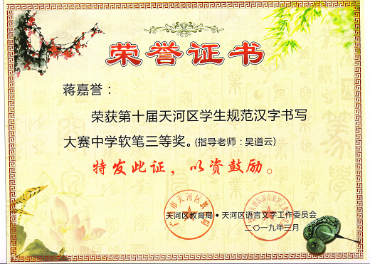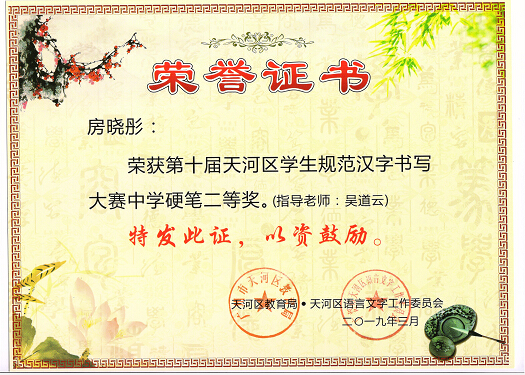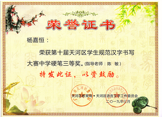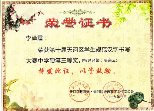 热烈祝贺我校师生在区教育局组织的第十届天河区学生规范汉字书写大赛中取得佳绩。其中王建威老师荣获教师硬笔三等奖,房晓彤同学,李泽霆同学,杨嘉恒同学荣获中学硬笔三等奖,蒋嘉誉同学荣获中学软笔三等奖,郑芯悦同学,欧阳天笑同学荣获小学硬笔三等奖。