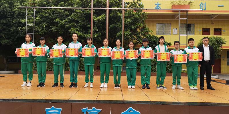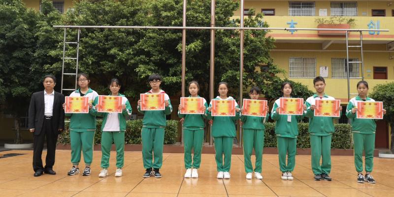 (强新举校长为2018全国少儿和平海报作品征集竞赛活动白云分展区获奖学生颁奖)
