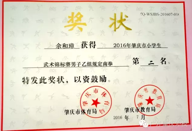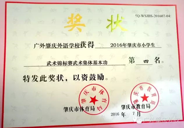 7月6日---7日,我校武术队参加了2016年肇庆市小学生武术锦标赛。本次大赛由肇庆市教育局,肇庆市体育局主办。肇庆市国家青少年体育俱乐部承办。