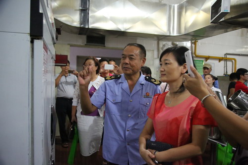 最后,与会人员走进我校食堂用餐区、厨房内各功能间参观。参观过程中,周校、郭副局长接受了区电视台的采访。