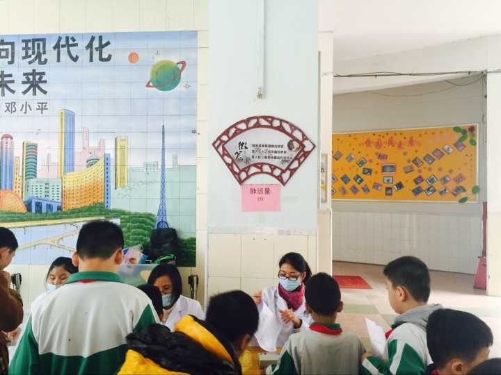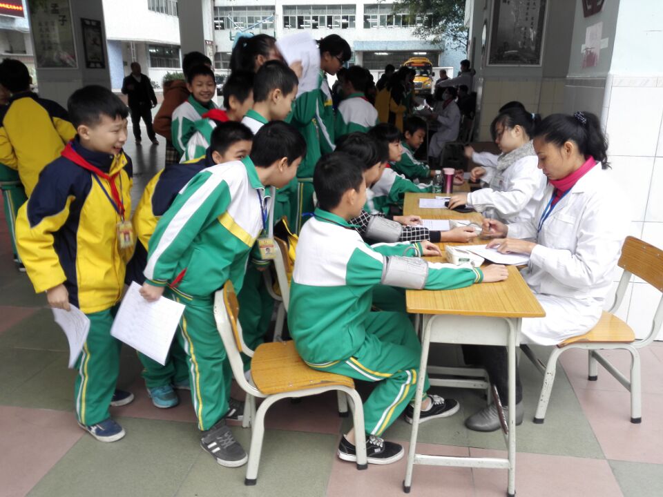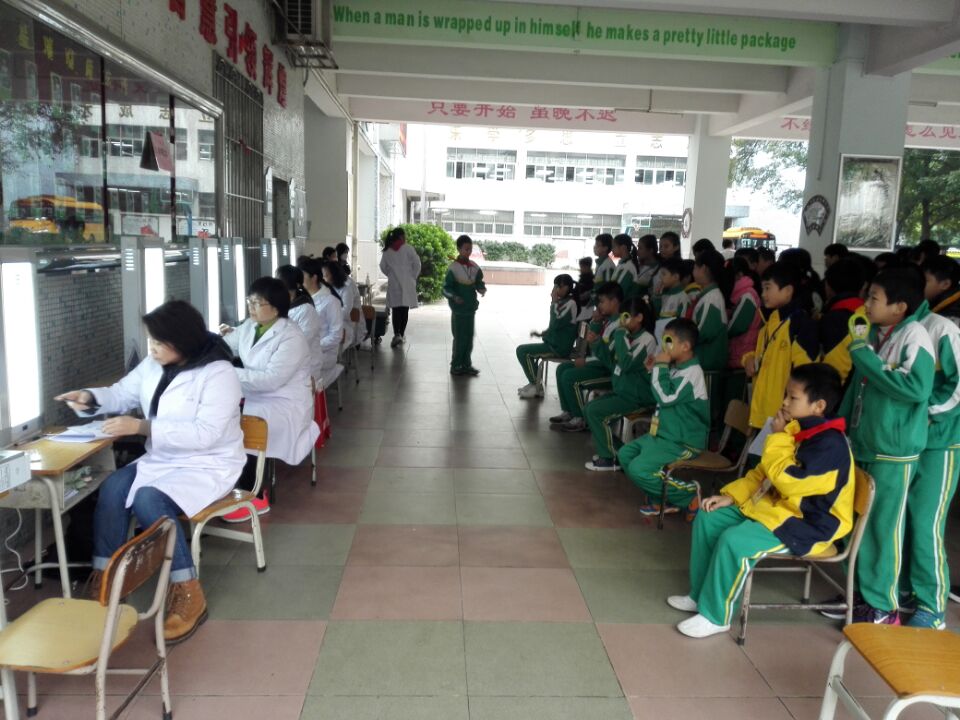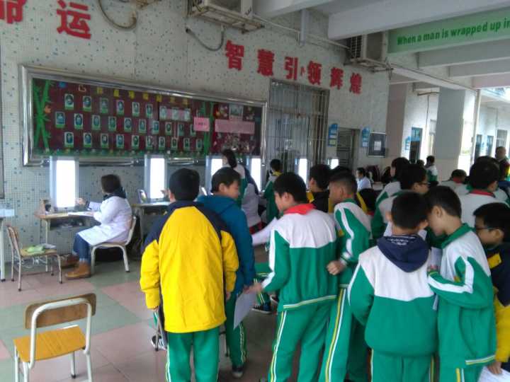 8:50分,张文清主任下达了检查指令,从六年级开始,在班主任的带领下,学生每人拿着个人信息已填好的检查单,排着整齐的队伍有序地来到一楼。按照流程顺序,分项检查。从身高体重、血压、五官、肺活量、内科、抽血------逐一流动检查。医生是那么认真、仔细,学生是那么规矩、开心。即使有偶尔抽血的哭声,那也是优美的伴奏乐曲,给整个流动大厅,带来欢声笑语。最兴奋的是当医生在检查单上印上“合格”的字样时,学生是何等的愉悦,以至于翻滚于地,喜气洋洋。