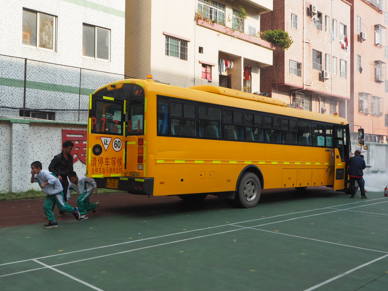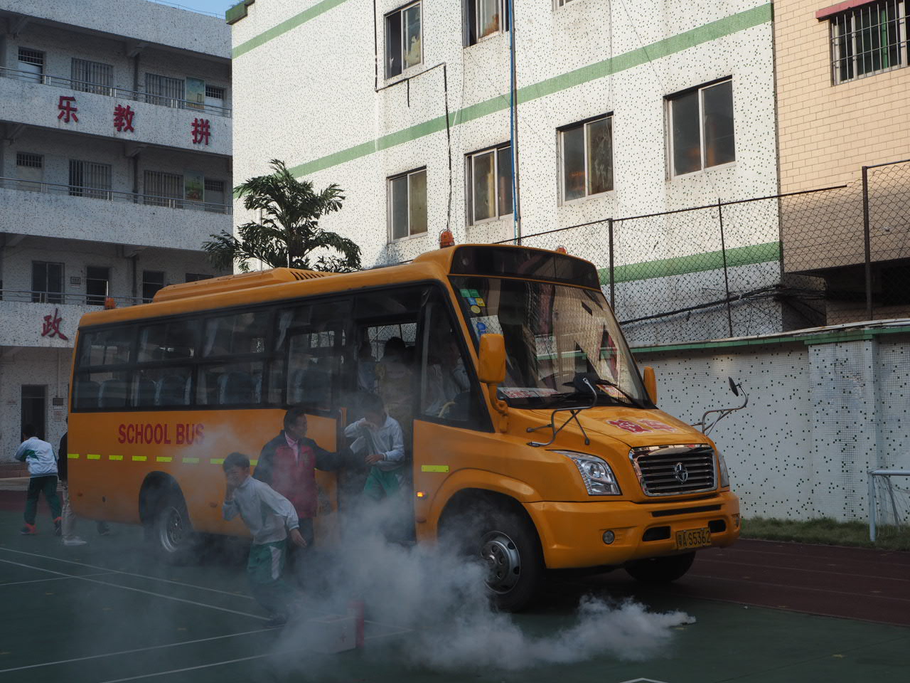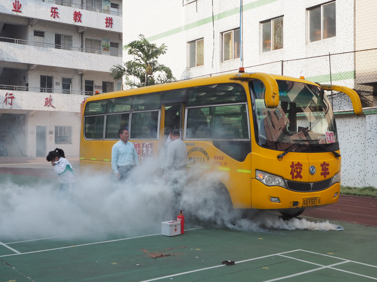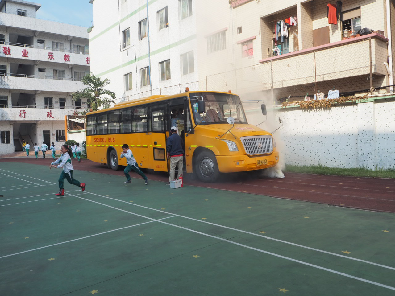 在实景模拟演练中,模拟放学时学生们像往常放学乘车那样快速、整齐集中在校园的跑道,跟车老师点名后,学生们有序上车。突然,校车侧边冒出“浓烟”,随着一声警报响起,校车里的学生顿时“骚动”起来,很快“浓烟”弥漫了整个车厢。在得到危险状况指令的第一时间里,校车司机迅速做出反应打开车门,跟车老师迅速组织学生用手帕捂住口鼻从车门和应急门两个途径有序撤出,被“解救”的学生在安全区域有序地集合,由带队老师清点人数,确保救援工作没有遗漏,整个疏散过程都控制在20秒之内。