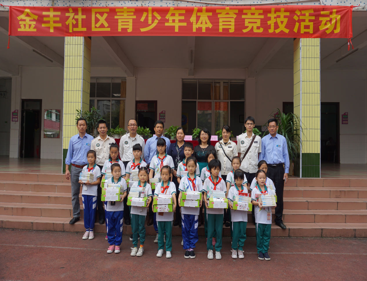 11月18日,红星学校热闹非凡。虽然临近“小雪”时节,但南国的秋意仍然不愿离去,秋阳毫不吝惜自己的热情,把阵阵温暖投向我们的赛场。由海珠区金丰社区赞助,红星学校承办的“金丰社区-红星学校阳光体育运动会”隆重开幕,江海街金丰社区居委会主任钟小萍女士,江海街外管服务中心主任吴丽华女士以及我校法制副校长社区片警张志雄警官、红星学校行政出席了开幕式。同时,金丰社区领导向本次运动会捐赠了丰富多样的奖品和书籍。