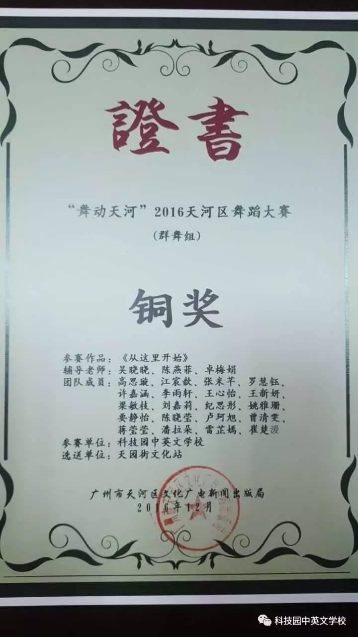 科技园中英文学校舞蹈队在“舞动天河”2016天河区舞蹈大赛中(群舞组),参赛作品《从这里开始》荣获: