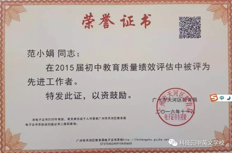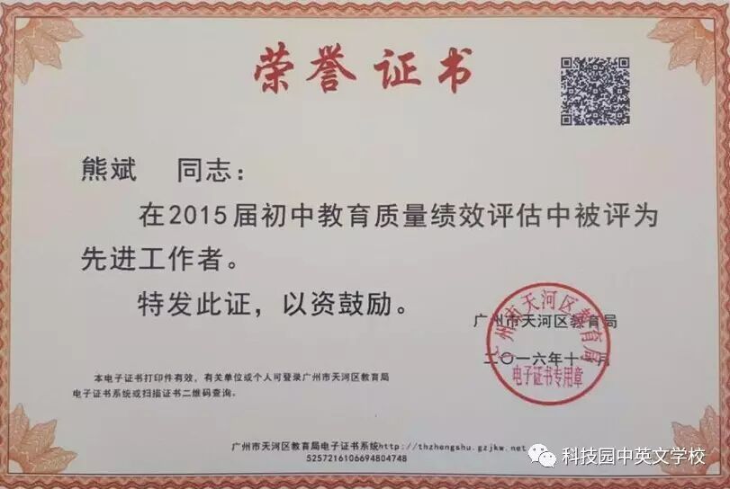 天河区2015届初中教育质量绩效评估中科技园中英文学校三位老师获奖