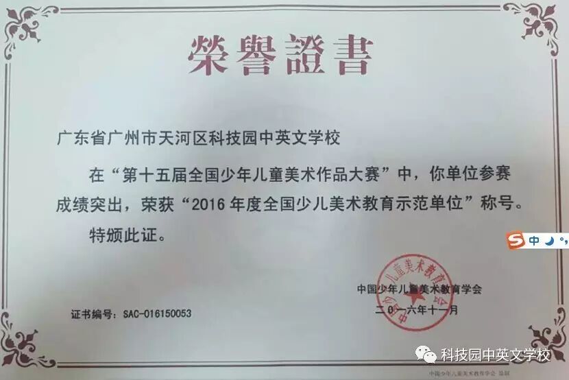 科技园中英文学校荣获“2016年度全国少儿美术教育示范单位”