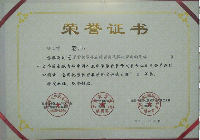 陆上辉老师《课堂教学存在的理由及解决理由的策略》荣获一等奖