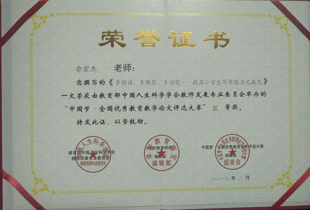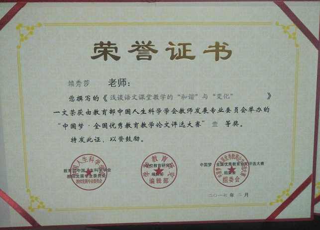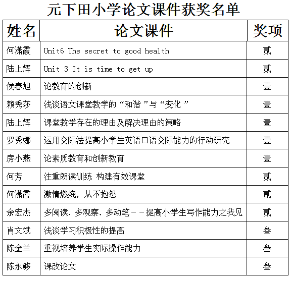 在2016年度“中国梦·全国优秀教育教学论文.课件评选大赛”评选活动中,我校共13人次获奖,为此,学校特向获奖教师表示祝贺,并希望全校教师以他们为榜样,为元下田小学科教再添新彩。