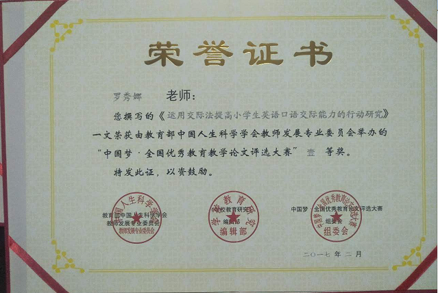 罗秀娜老师《运用交际法提高小学生英语口语交际能力的行动研究》荣获一等奖