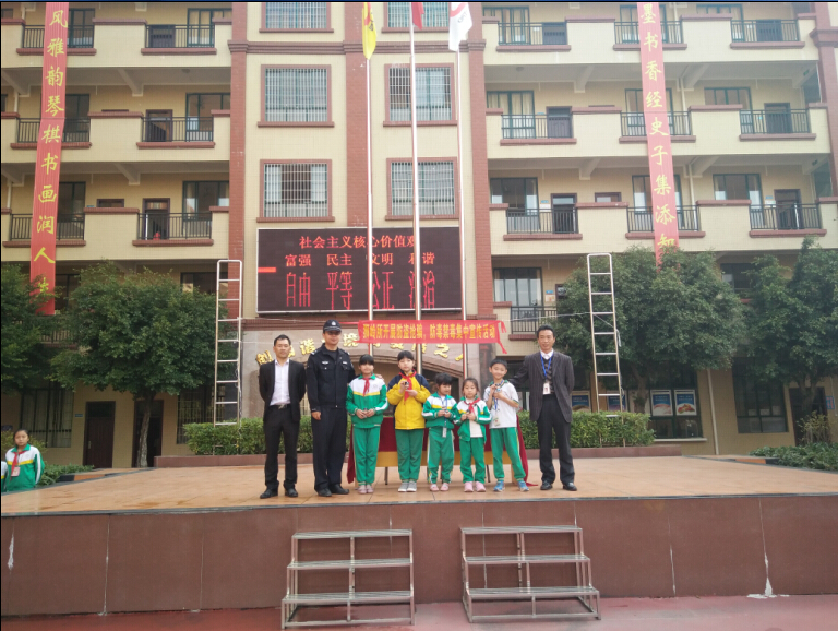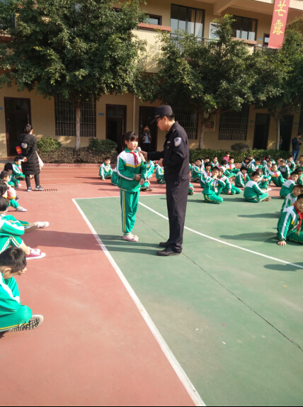 早上8:30,旭日东升,天气晴朗,狮岭派出所的唐警官和汤警官按时来到我校。在升旗仪式后,唐警官兴致勃勃地走上舞台,介绍了当前的治安形势,剖析了各种违法行为给社会带来的危害,并重点介绍了中小学生如何防范盗窃、抢劫、诈骗、赌博、毒品等各种违法犯罪,确保自身安全。叔叔们结合典型案例,现身说法,将枯燥乏味的安全教育讲得生动活泼,深深地吸引了孩子们。