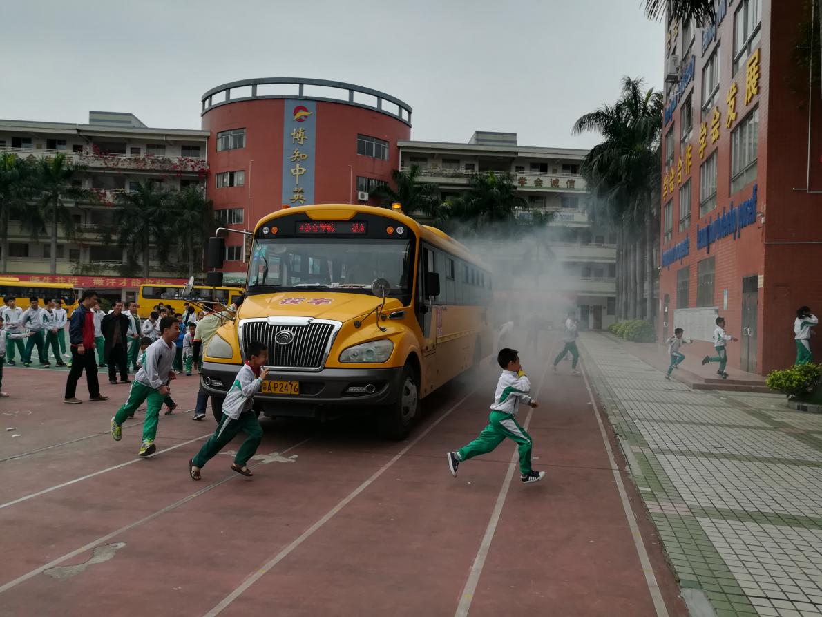 为增强全体师生校车安全防范意识,提高驾乘人员应对突发意外事故和自我保护能力,4月13日下午14:30,博知中英文学校对所有乘坐校车的学生开展了校车消防疏散演练活动。