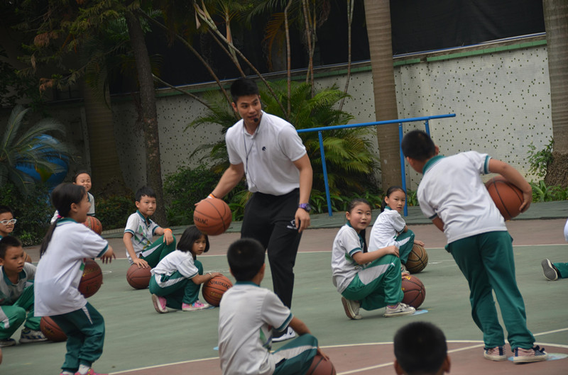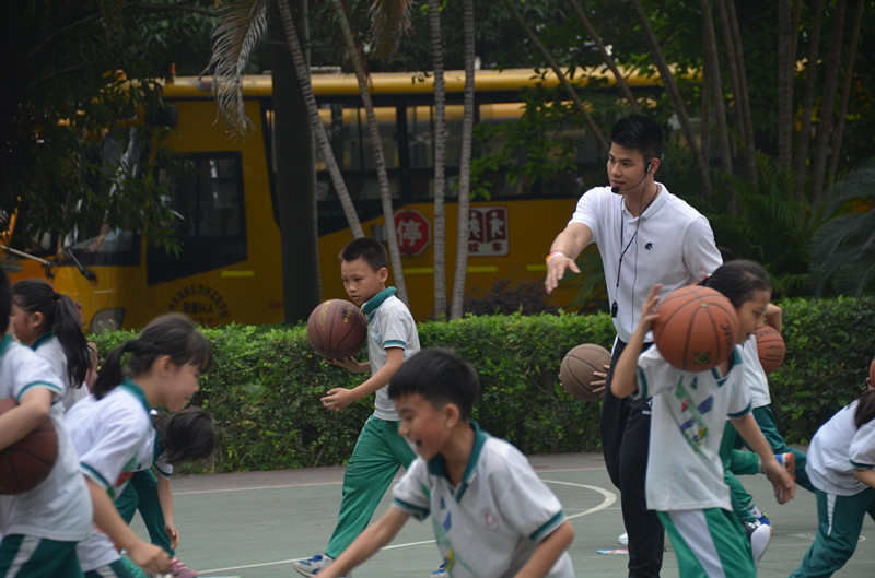 给四年级的同学们来上体育课的是秦梓伟老师,他上课的内容是篮球行进间运球。