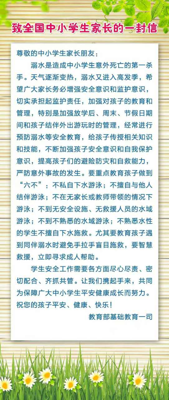 近年来,溺水事故成为导致学生意外伤害的“头号杀手”,做好防溺水工作将有效控制学生非正常伤害。根据教育部基础教育一司《关于做好2017年中小学生安全教育工作的通知》(教育部基教一司函﹝2017﹞9号)要求,为全面落实学校防溺水教育主体责任,强化家长防溺水监护责任,防范和遏制学生溺水事故,我校在4月24日开展“2017年全国中小学生(幼儿)预防溺水专题教育”主题班会活动。