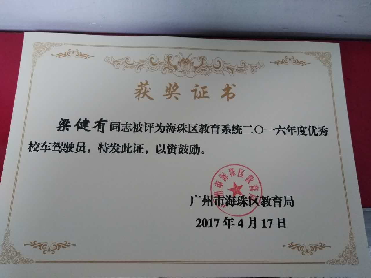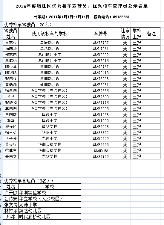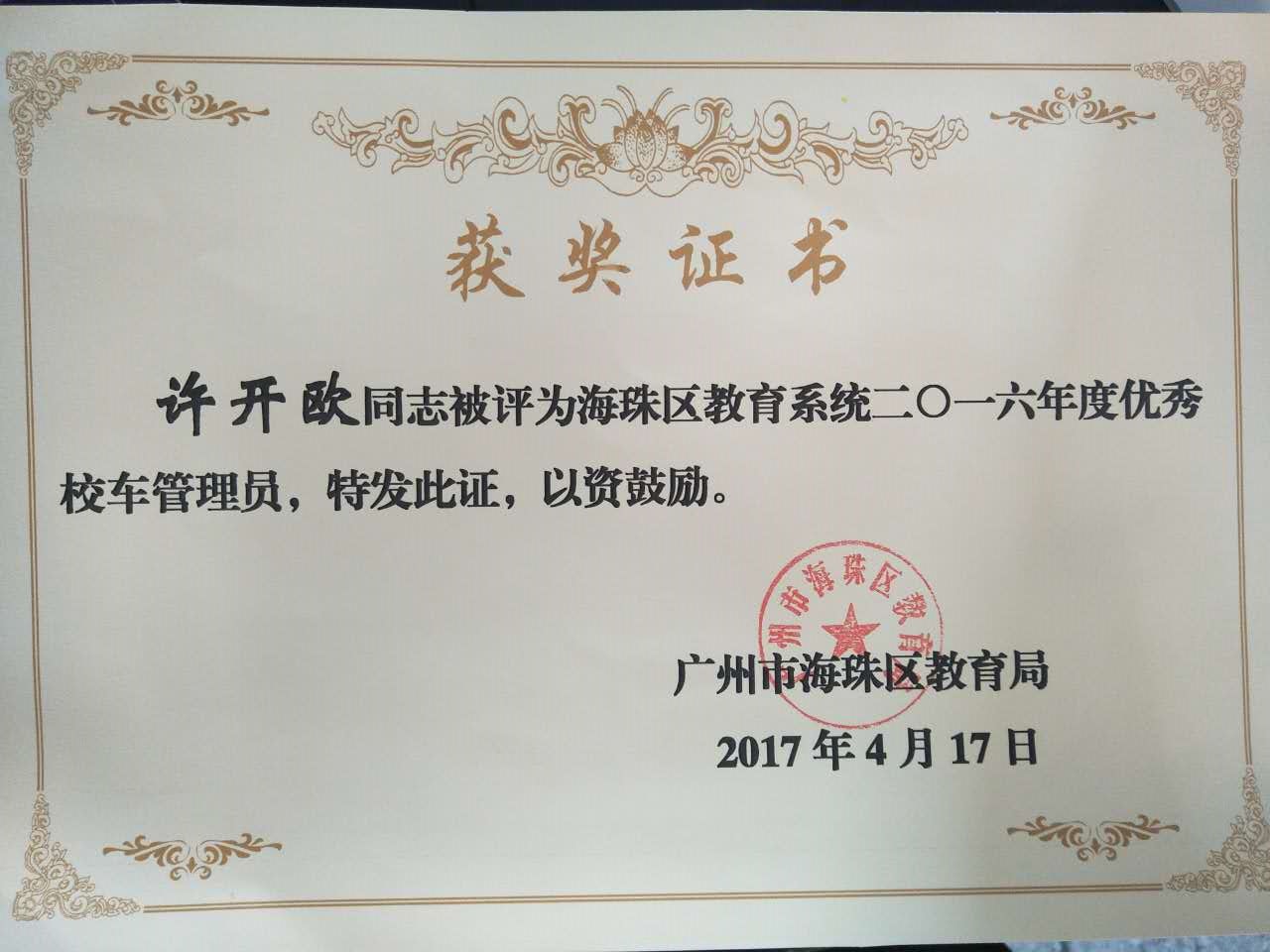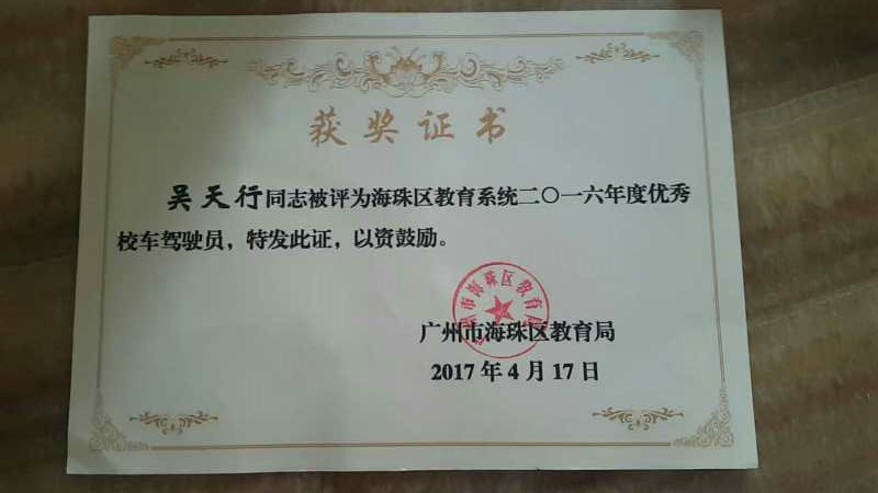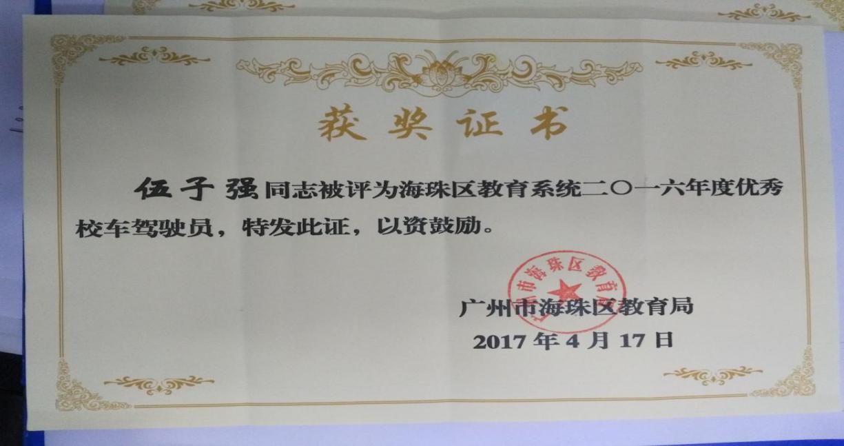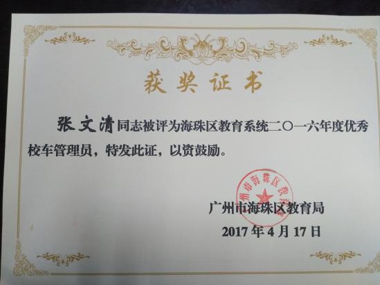 为进一步做好学校校车接送学生的安全工作,调动学校校车安全管理者的工作积极性,提高学校管理者对安全工作的重视,海珠区教育局根据《关于评选表彰2016年度学校优秀校车管理员和优秀校车驾驶员的通知》精神,结合年度考核、日常安全检查情况,对我区在学校校车安全管理工作中做出突出贡献的个人进行表彰,在全区一百多间中小学、幼儿园中评选出五名优秀校车管理员和二十名优秀校车驾驶员。龙涛小学主任张文清、司机伍子强,华洲实验学校主任许开欧、司机梁健有、吴天行等五人在全区脱颖而出,喜获“优秀校车管理员”和“优秀驾驶员”殊荣。
