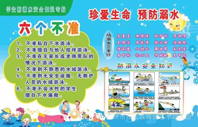 能力,严防意外事故的发生。要重点教育孩子做到“六不”:不私自下水游泳;不擅自与他人结伴游泳;不在无家长或教师带领的情况下游泳;不到无安全设施、无救援人员的水域游泳;不到不熟悉的水域游泳;不熟悉水性的学生不擅自下水施救。尤其要教育孩子遇到同伴溺水时避免手拉手盲目施救,要智慧救援,立即寻求成人帮助。