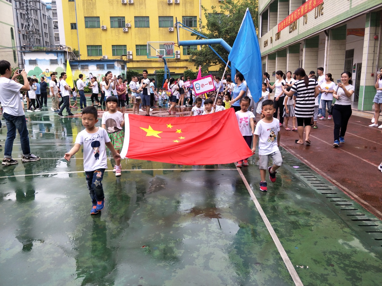 在入场式上,伴着运动员进行曲,幼儿园国旗队的4名小朋友护着鲜艳的五星红旗迎面走来,跟在他们队伍后面的是小、大、中三个年龄段9个班的小朋友,他们迈着整齐的步伐,喊着嘹亮的班级口号,向家长们展示着自己的风采。