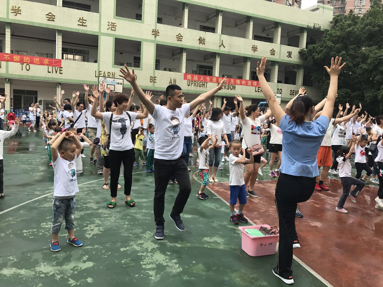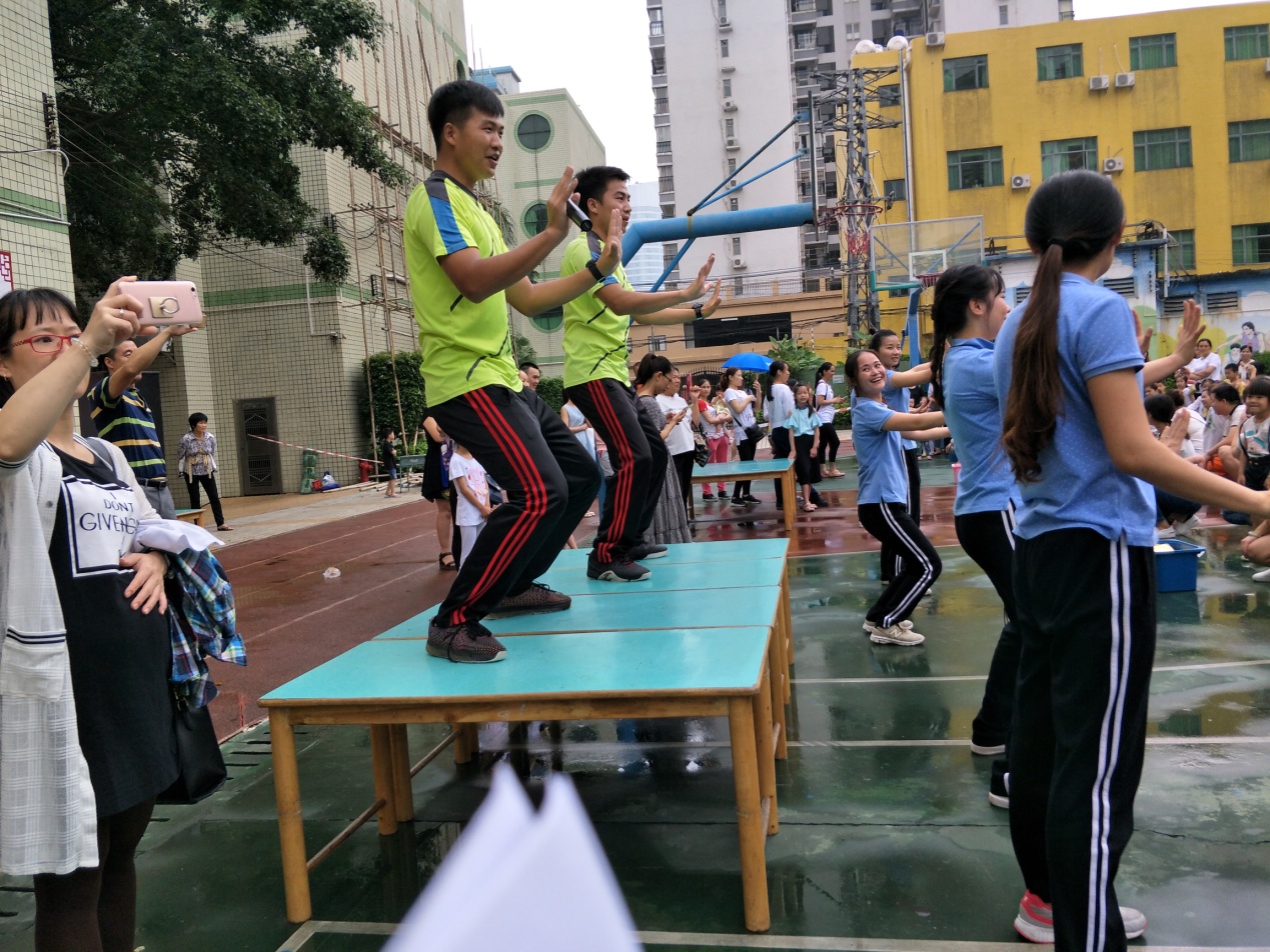 尽管天公不作美,但是淅淅沥沥的细雨阻挡不了孩子和家长们的热情。开完家长会后,9点40分,雨停了,天放晴了,在老师们的精心筹备下,体能活动终于拉开了序幕。