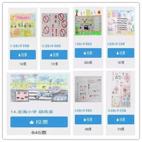 随后,校级优秀作品被上传到江海街道官方微信公众平台(微社区e家通江海微音)进行网络评选,把此次活动掀向了高潮!最终,在五月下旬,我校廖悉名同学、胡凤姿同学分别以3024票、645票夺得街道办校际评比第4、8名的好成绩,可喜可贺!以下是我校部分学生作品得票情况。
