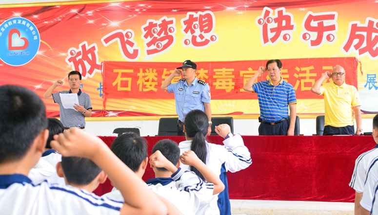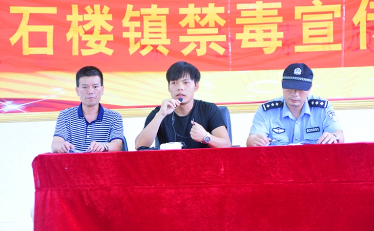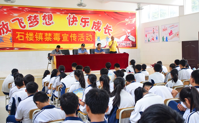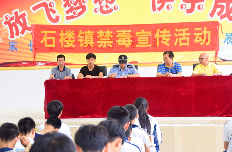 杨警官作了重要讲话,讲话中分析了对毒品的充分认识及毒品对身心的危害,列举了一个个触目惊心的案例,呼吁人们要远离毒品,拒绝毒品。石楼镇禁毒专干陈泽权同志重点讲述了如何应对毒品的危害。戒毒成功人士陈树明讲述了自己从好奇尝毒,吸毒上瘾到成功戒毒的不堪回首的人生坎坷之路,以身说法,控诉了毒品的危害,告诫学生慎交朋友切莫沾染毒品。
