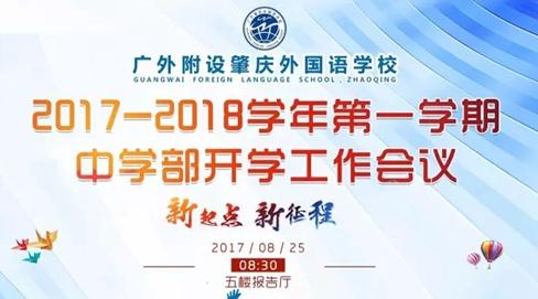 中学部召开新学期工作会议广外肇庆外国语学校8月25日上午,我校在五楼报告厅举行了中学部教师开学会议,此次会议主要是对新学期中学部各项教学工作的布署。周小飞校长、顾长春副校长以及中学学生处陆艳兵主任参加了会议,会议由中学部李升颖副主任...