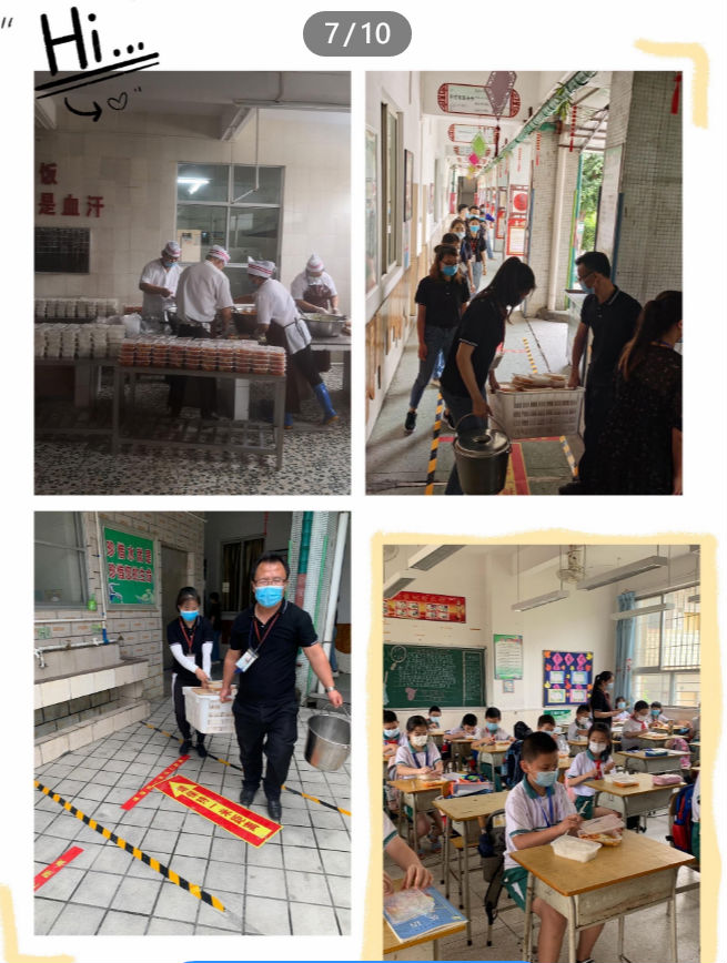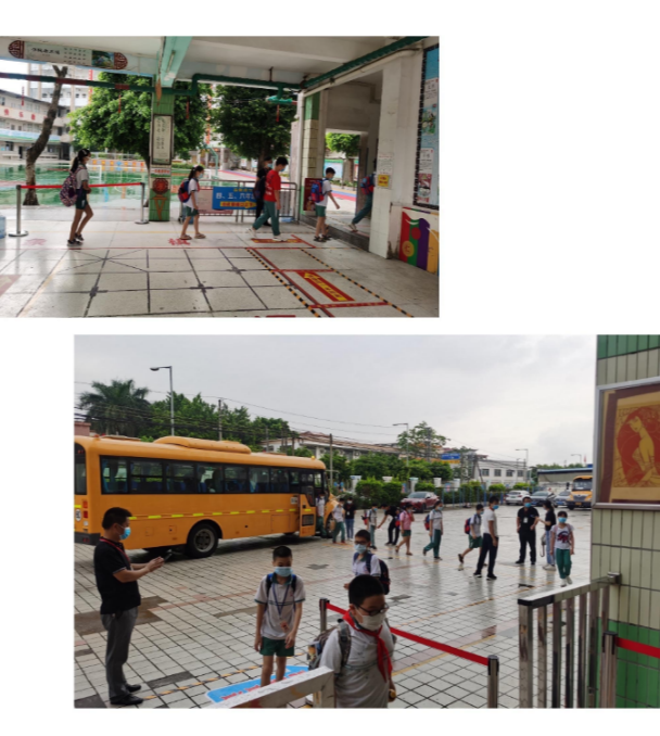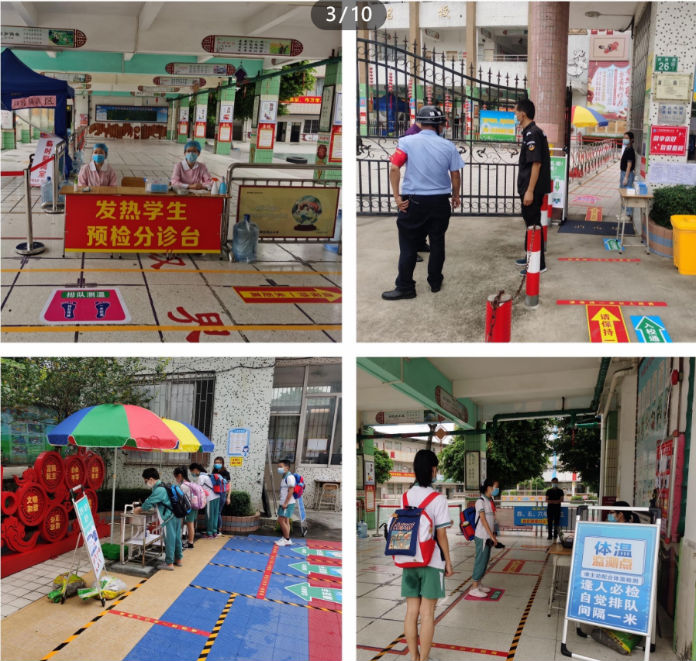 晨光初露,番禺区同心小学的老师、校医、安保、消杀人员,以及负责体温监测、应急处置、校园秩序等人员,准时到位,迎接孩子们“回家”。在复学前学校全体教职工已经进行了多次培训和复学演练,对校园和教室等公众场合也进行了多次消毒,确保防疫卫生安全。