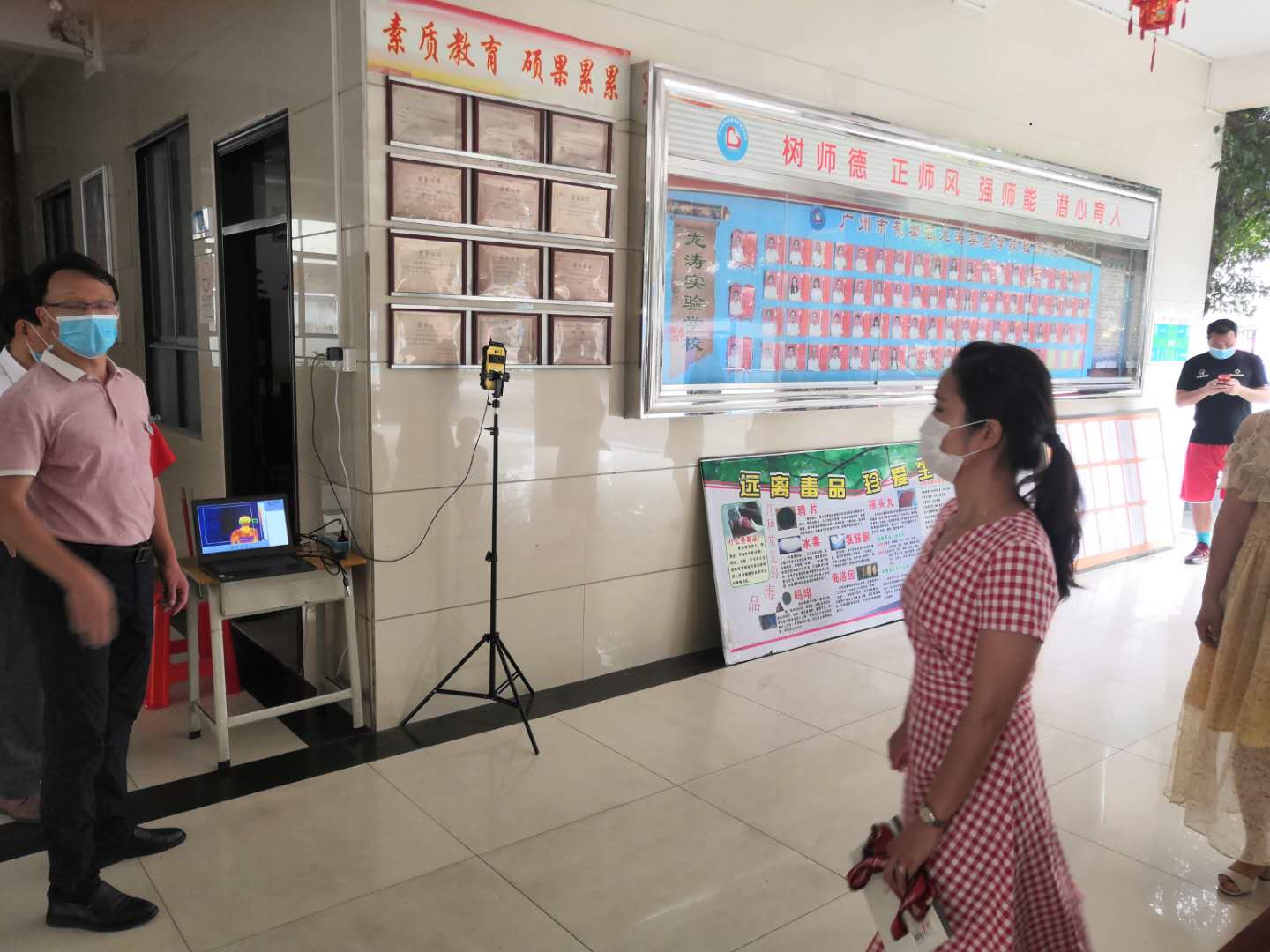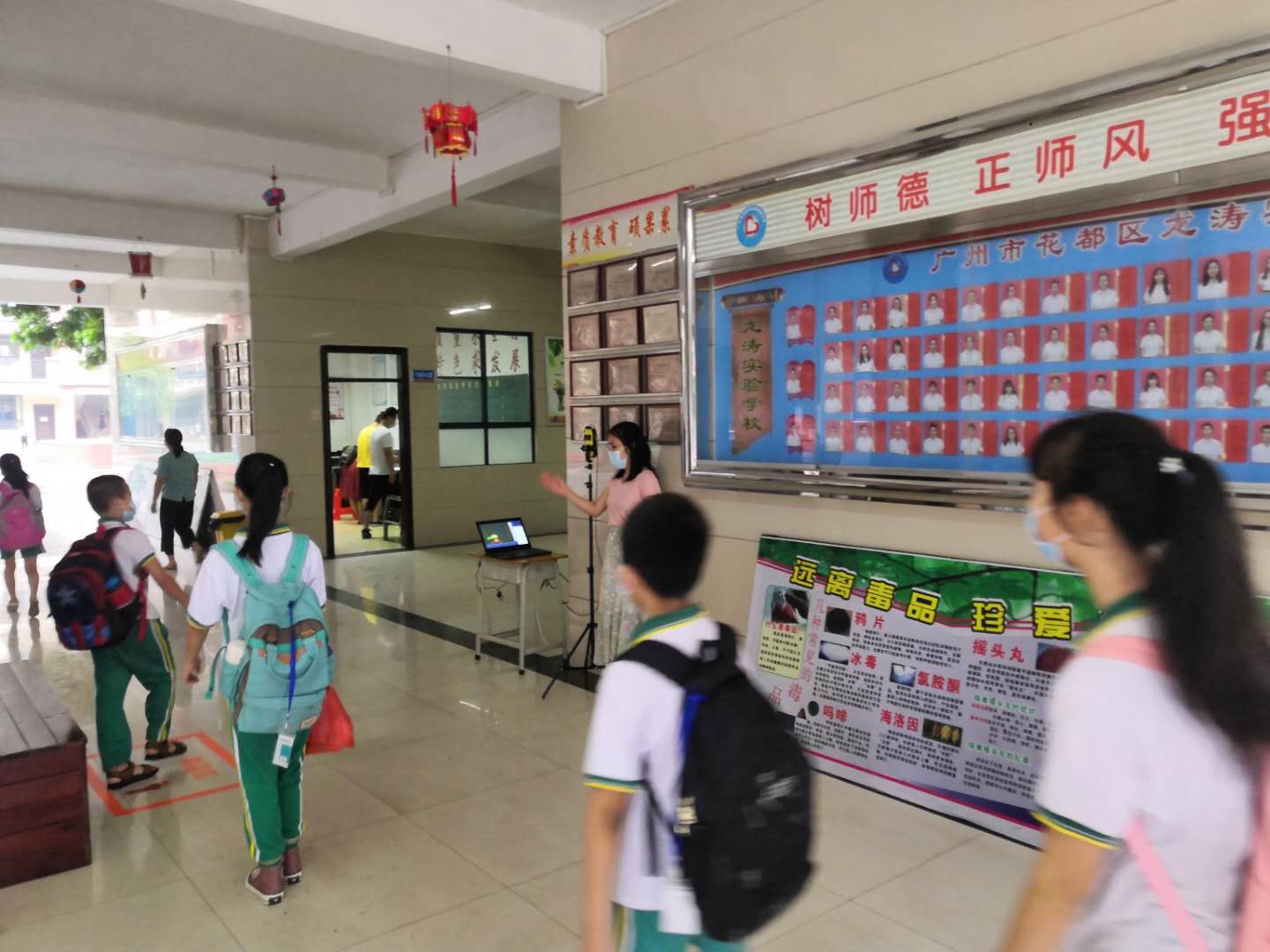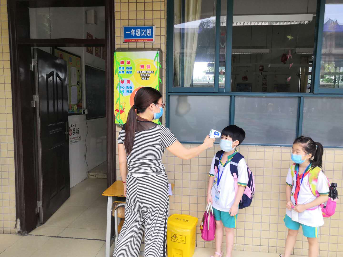 学生经校门口额温枪测温、校内红外线测温后按指定路线到达教室门口,由班主任第三次测温并登记体温,严防疫情输入。
