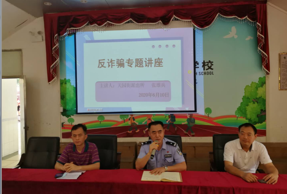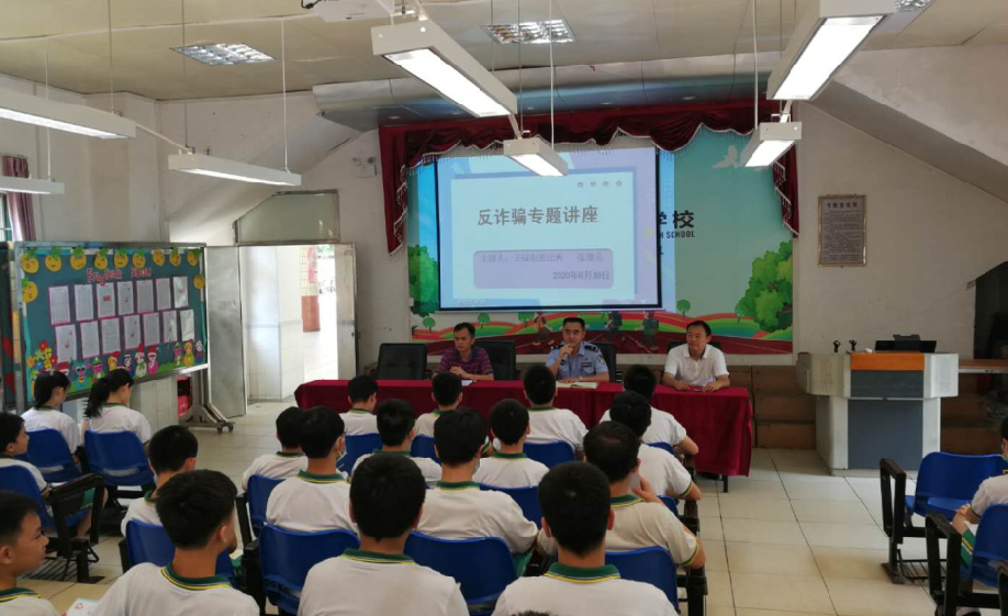 6月10号上午,我校法制副校长张雄兵民警给初一年级同学开展防诈骗讲座活动,为同学们揭开诈骗的神秘面纱,提高防诈骗能力。