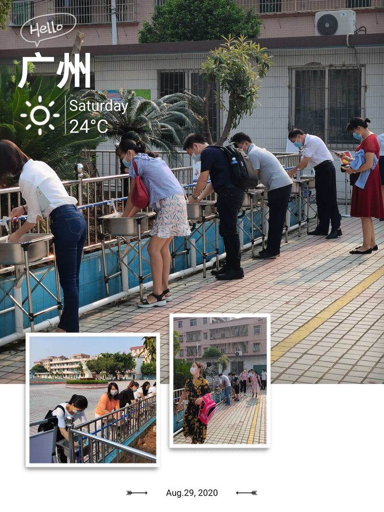为做好校园疫情防控的要求,所有进校家长在校门由学校教师指引逐一扫码、测温、洗手进入校园内。