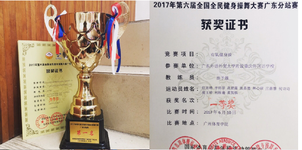 本次比赛,在全省125个参赛单位近3000人中,我校健美操队的队员们沉着应战,稳定发挥,体现出优秀的团队协作精神,最终获得“全国全民健身操等级规定动作-有氧一级”特等奖第一名与“有氧健身操”一等奖的两项优异成绩,直接晋级全国总决赛!