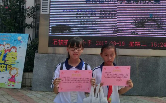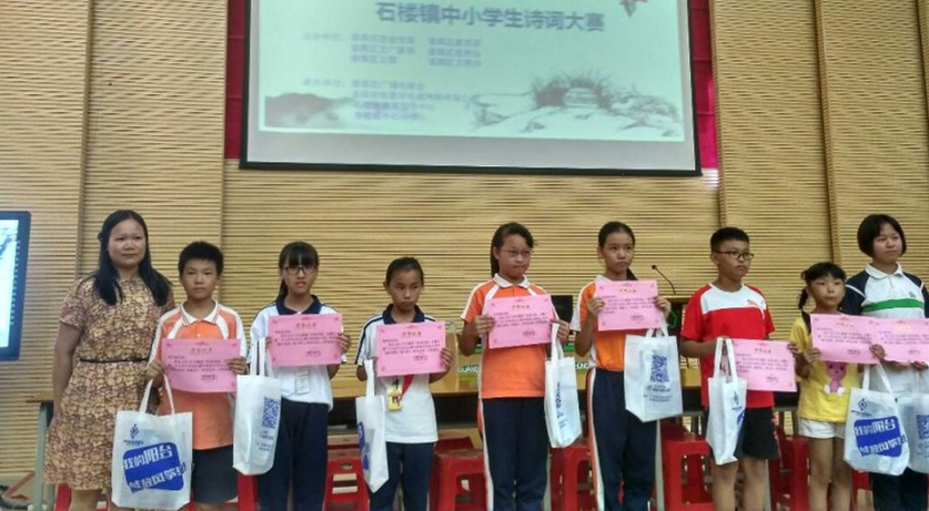 9月19日下午,番禺区中小学生诗词大赛在石楼镇中心小学举行,来自镇内的18所中小学生代表参加了本次比赛。我校七年级1班邓永欣同学荣获二等奖、五年级1班郭彩欣同学荣获三等奖;梁宇婷老师荣获优秀指导老师。