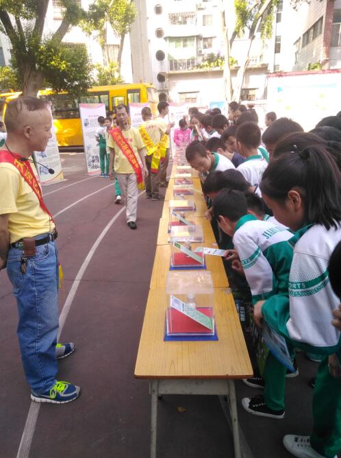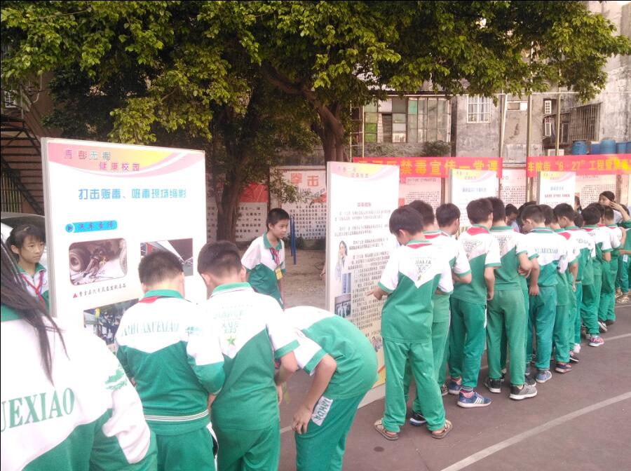 活动第二部分,在天河区车陂街道禁毒办四名志愿者的引领下,同学们参观了大型宣传图片展和部分仿真毒品模型展,志愿者还向同学们分发了有关毒品的知识卡片。