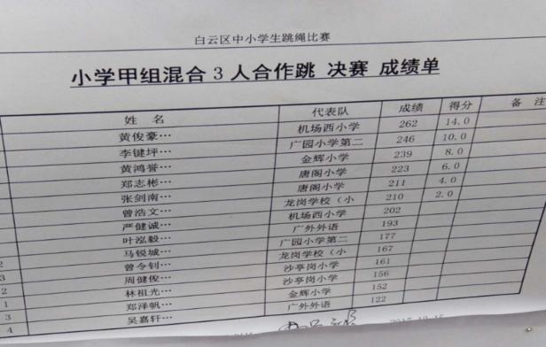 2017年12月15日,在颜乐天纪念中学举行的2017年白云区中小学跳绳比赛中,白云区金晖小学以永平片唯一一所出队的学校,在面对强队时没有退缩和放弃,反而努力拼博,奋勇向前,最后小学甲组混合3人合作跳以239分的好成绩夺得第三名。