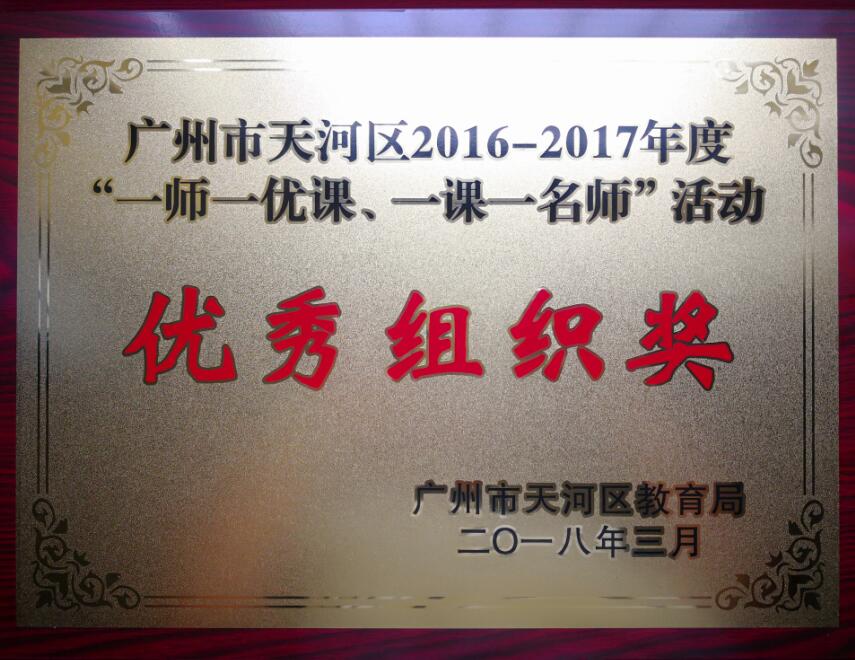 2018年4月10日上午,天河区2016—2017年度“一师一优课、一课一名师”活动总结表彰大会在广州市天河外国语学校召开。我校在此次活动中表现突出,晒课数在公民办中小学中排名全区第四名,获“优秀组织奖”。