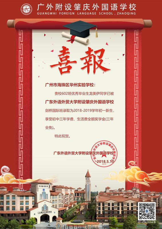 教学质量是学校的立校之本,我校所属集团也高度重视,每年都会举行联考,在今年的联考中我校再创佳绩,参考的各年级各科目成绩都名列前茅。在众多优秀学子中,有一个叫龙美伊的学生,创造了“奇迹”。她在本次几千人参与的联考中取得了第二名的好成绩。同时被广外附设肇庆外国语学校剑桥国际班录取,并获得约16万元奖学金。初中三年费用全免(包括全年学费、校车费、住宿费、伙食费、校服费、生活服务费等等)。