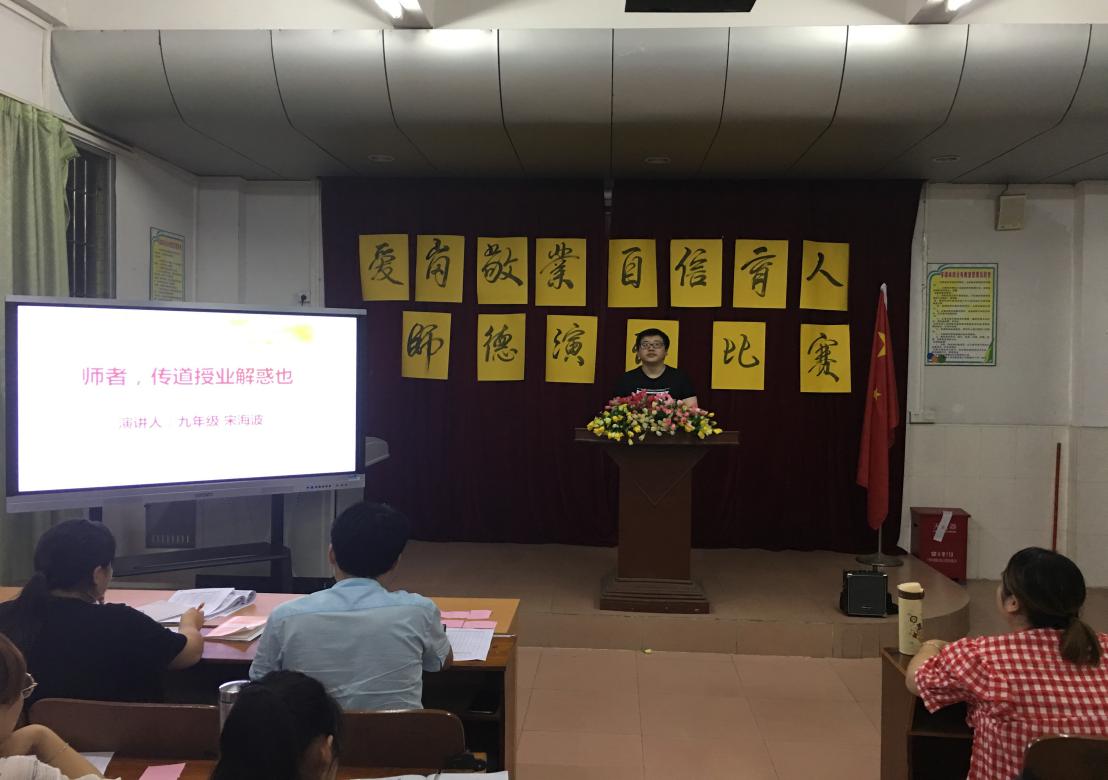 九号出场的是语文老师宋海波,他演讲的题目是《师者、传道授业解惑也》。