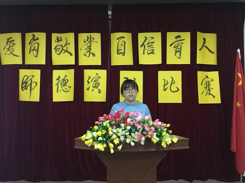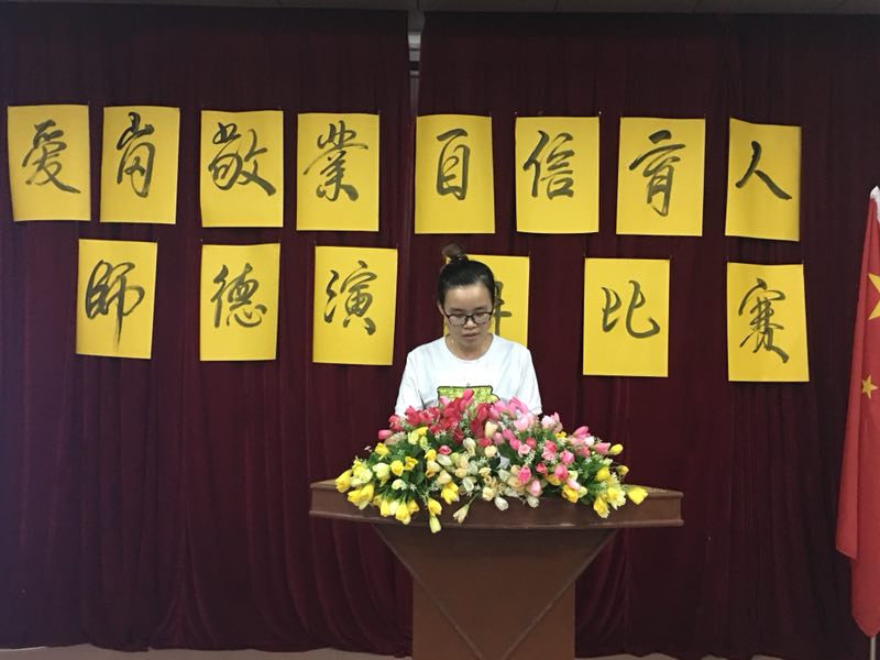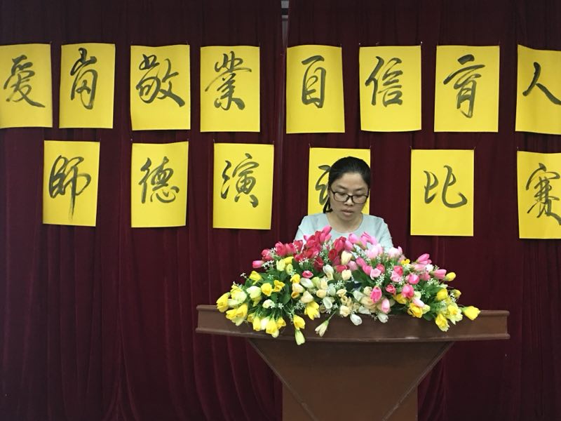 一号出场的是语文老师张丽芬,她演讲的题目是《立师德、正师风、强师能》。