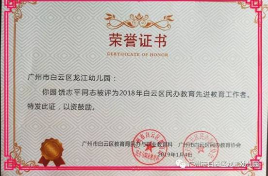 龙江幼儿园在龙涛教育集团大力支持和饶园长的领导下,全体教师齐心协力下,荣获了2018年广州市白云区民办教育协会“先进单位”;饶志平园长被评为2018年民办教育协会“先进工作者”;黄秀玲老师、何雪霞老师被评为2018年民办教育协会“先进教师”。