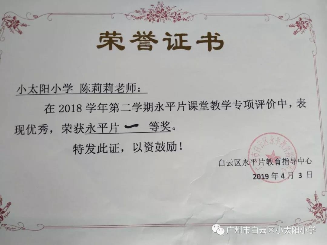 小太阳小学又传来喜讯: 陈莉莉老师荣获永平片综合科课堂教学专项活动一等奖!喜讯传来,校园里到处洋溢的是喜悦。