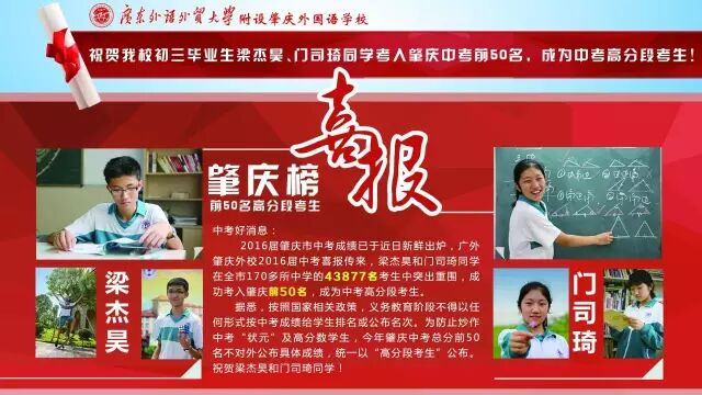 2016届肇庆市中考成绩已于近日新鲜出炉,广外肇庆外校广外肇庆外校2016届中考喜报传来,梁杰昊和门司琦两位同学在全市170多所中学的43877名考生中突出重围,成功考入肇庆前50名,成为中考高分段考生。