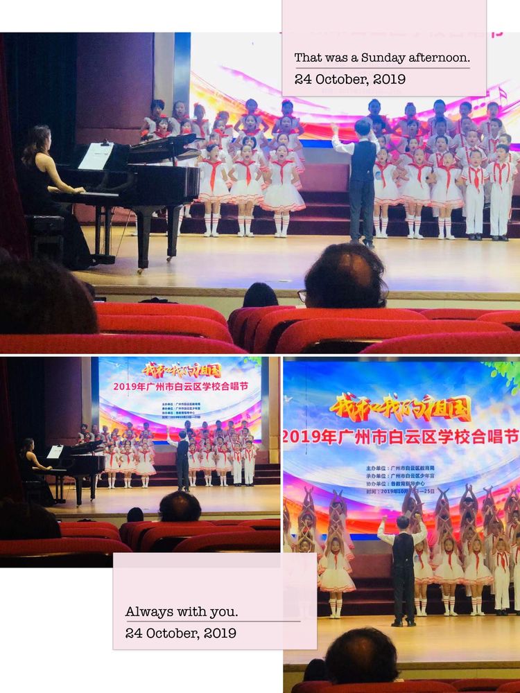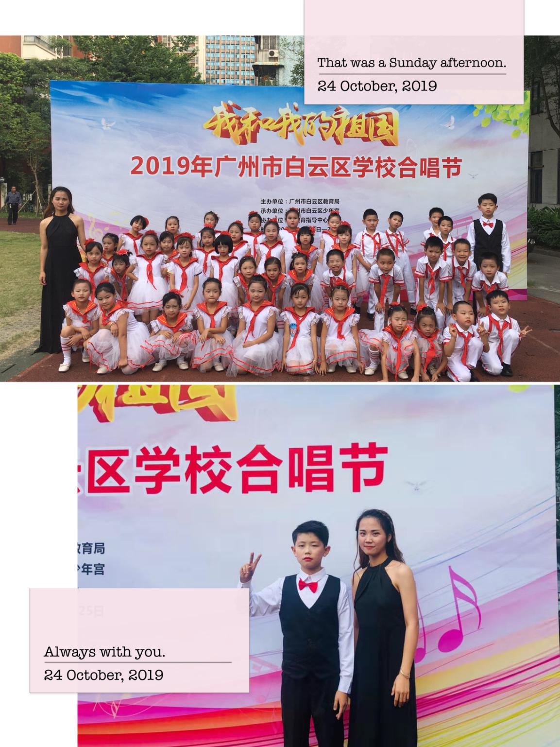 10月24日下午,广州市白云区长鸿小学合唱队42名学生,5名带队教师赴广州市白云区少年宫参加2019年广州市白云区学校合唱节,演唱曲目均为具有年代特色的《娃哈哈》、《共产儿童团》,本次合唱队41名同学全部由二年级学生组成,指挥也是由6年级的王毅同学担任,音乐教师吴琳为指导教师。