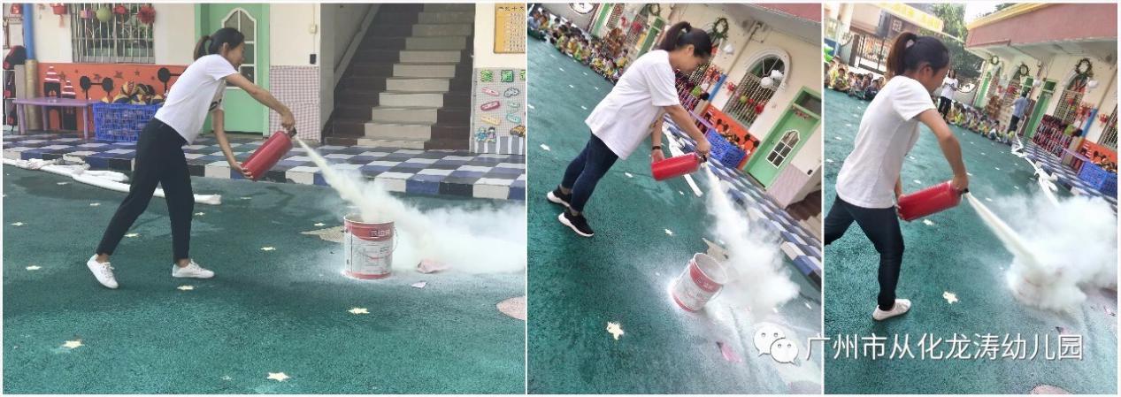 我们的保安师傅也向全体师幼演示如何正确使用灭火器和消防水枪。